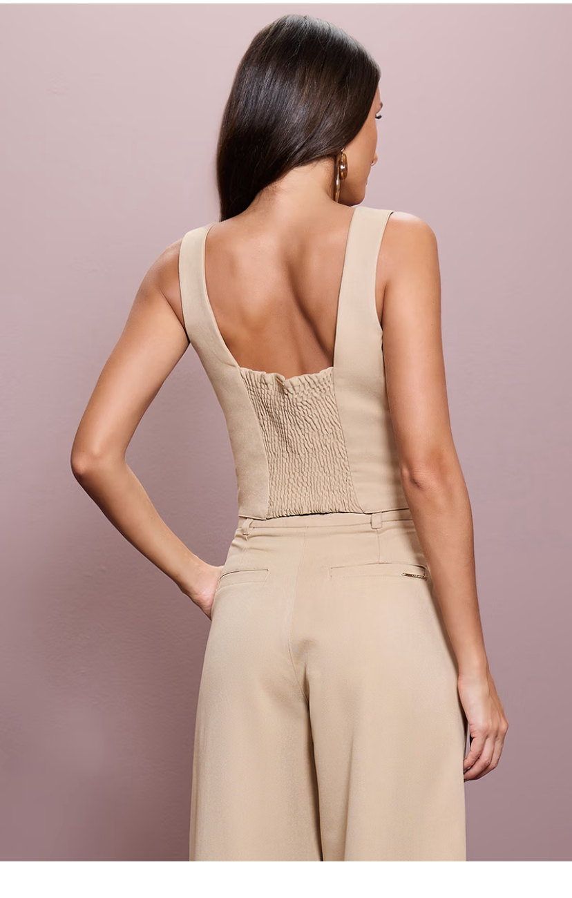 tecido alfaiataria encorpado, modelagem ajustada ao corpo, decote em formato coração, fechamento frontal por botões encapados, alças largas, detalhe de recorte na parte frontal, lastex na parte posterior.