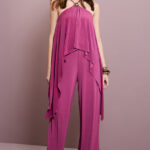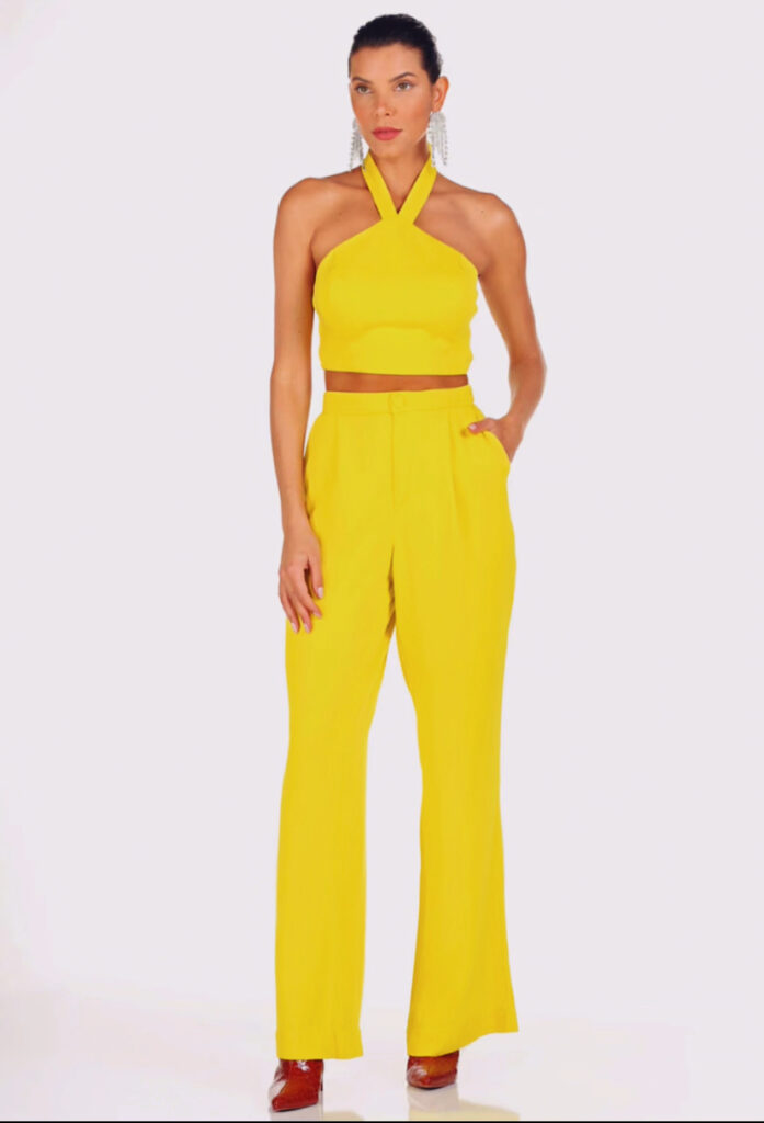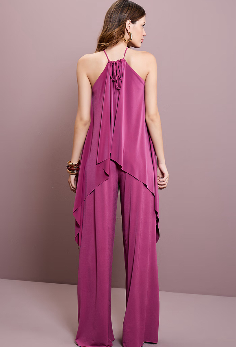 conjunto em jersey com metal, blusa de modelagem solta, comprimento alongado, decote halter com detalhe metálico central, alças finas com amarração posterior, camadas de tecido sobrepostas na parte frontal e lateral, acabamento pespontado, calça de modelagem ampla, caimento fluido, cintura alta, cós elástico, acabamento pespontado.