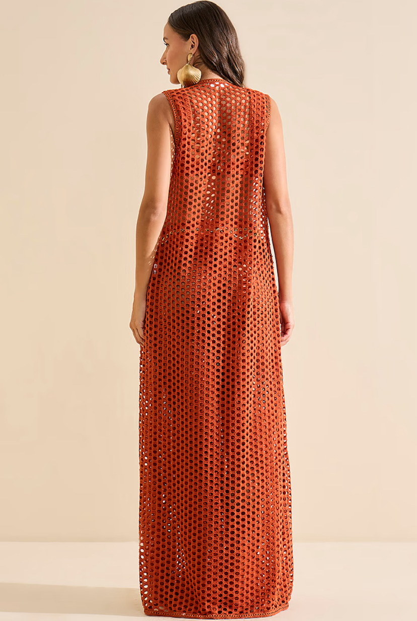 saída de praia em tecido tricô vazado com textura de furos, longo sem mangas com modelagem reta, comprimento longo, acabamento em barra reta, feito a mão.
