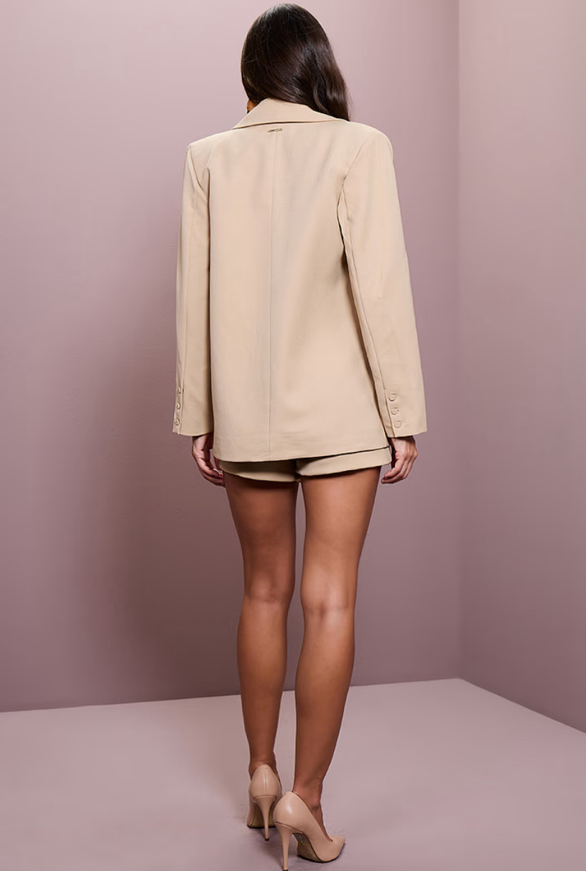 cintura alta, cós com passantes, fechamento frontal por zíper e colchete interno, bolsos laterais embutidos, recortes estratégicos na parte frontal, modelagem estruturada, acabamento pespontado.