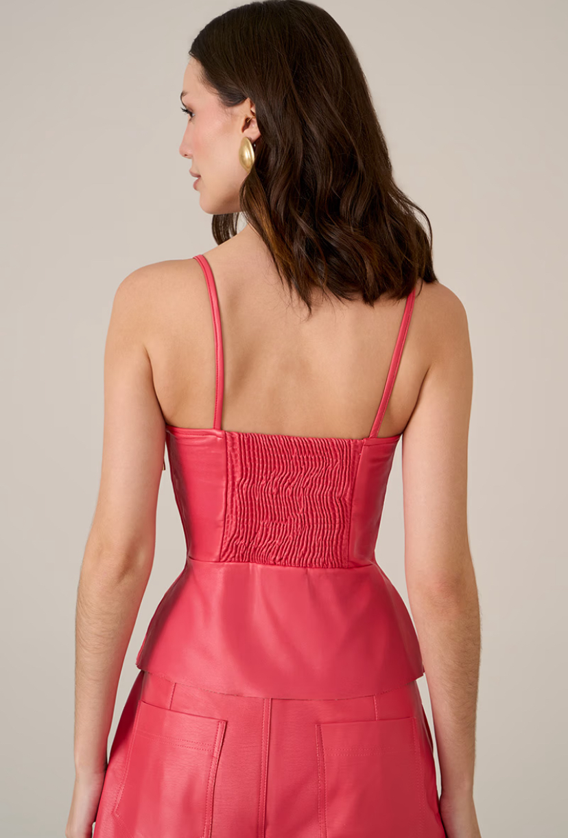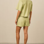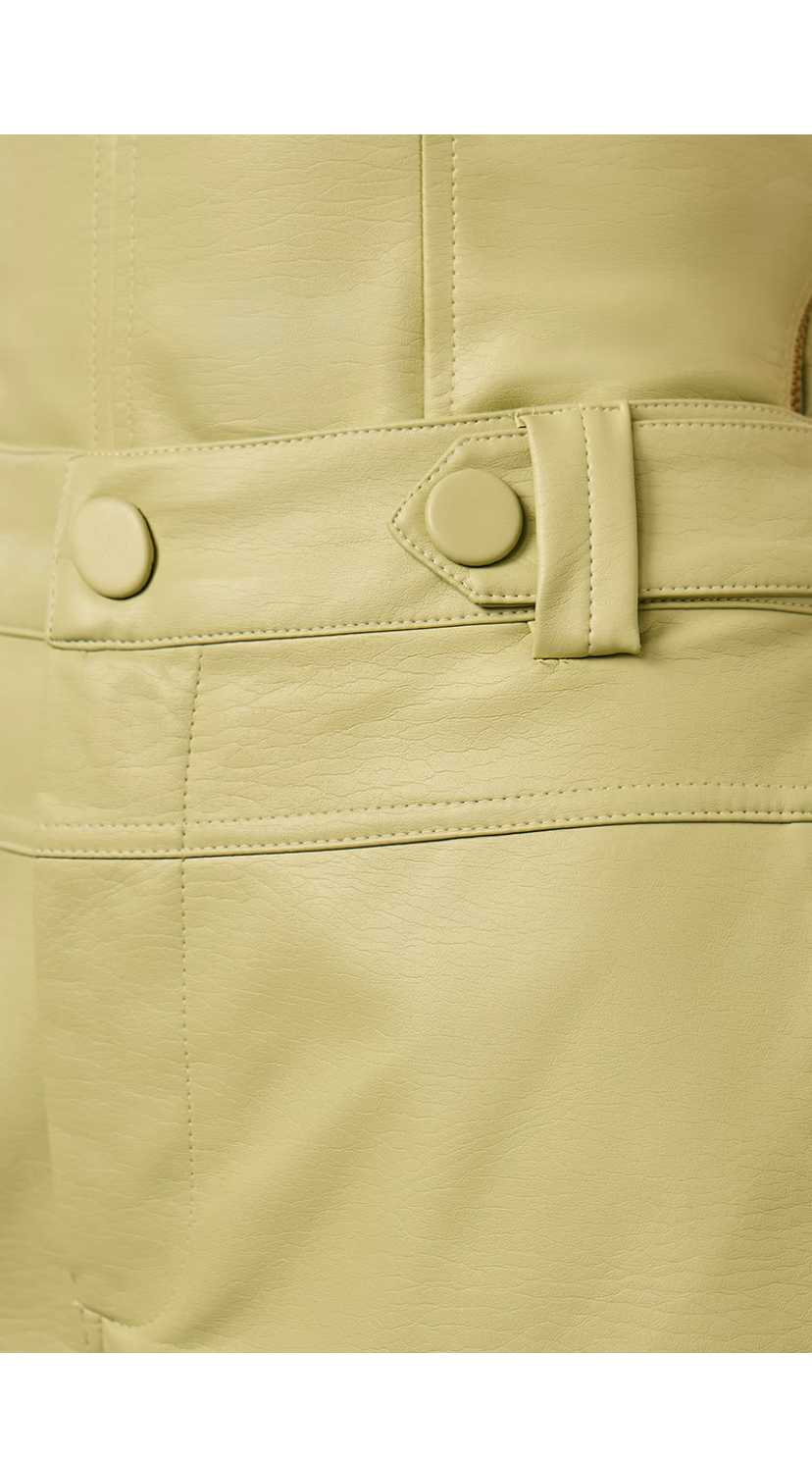 shorts em material sintético similar a couro, modelagem reta, cintura alta com detalhe de cinto embutido e botões decorativos, bolsos traseiros falsos, fechamento frontal por zíper e botão, tecido estruturado com leve brilho, comprimento curto, acabamento em barra dobrada. medidas aproximadas da modelo P, altura 1,73m, busto 83, cintura 63, quadril 91