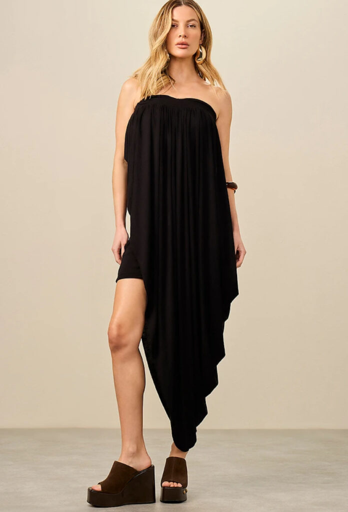 O vestido curto em malha com pontas combina sensualidade e sofisticação através de sua modelagem bodycon que abraça as curvas naturalmente, apresentando gola alta que adiciona elegância e modernidade ao visual, a modelagem sem mangas destaca os ombros criando uma silhueta refinada, o franzido estratégico ao longo do corpo modela a figura de forma lisonjeira, o detalhe de pontas laterais oferece movimento único, o comprimento curto alonga as pernas criando proporções perfeitas, a textura da malha garante conforto e elasticidade sem comprometer o ajuste impecável, sendo ideal para ocasiões especiais que exigem presença marcante.