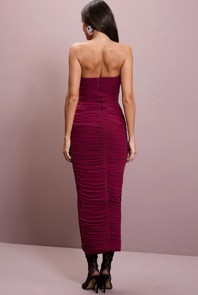 vestido midi confeccionado em tule, modelagem ajustada ao corpo, comprimento midi, decote reto, sem alças, detalhe de franzidos por toda a peça, fechamento traseiro por zíper invisível.